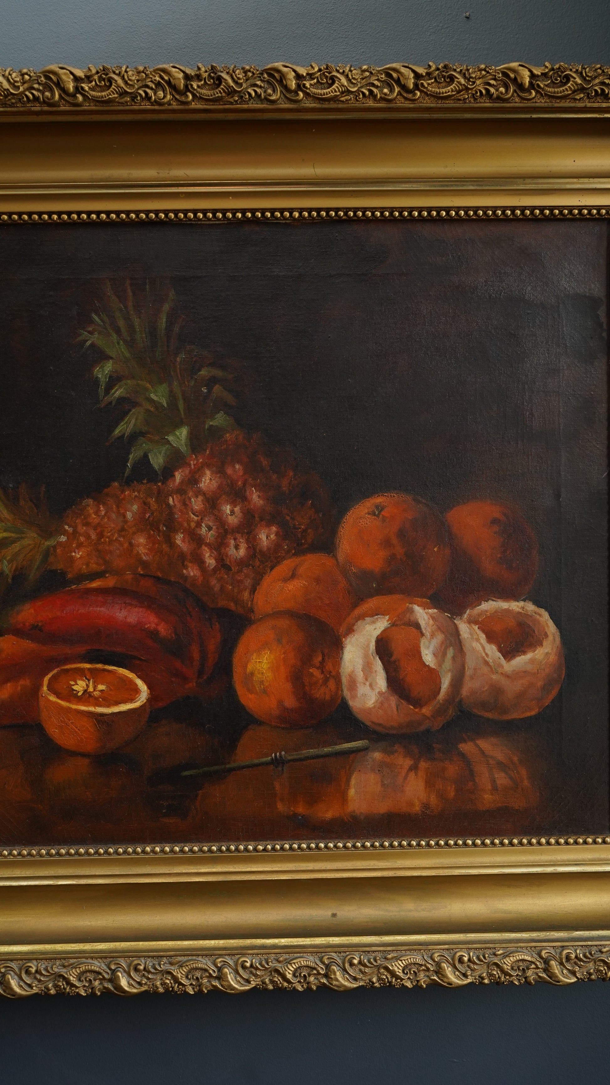 Antique European Still Life Oil Painting with Pineapple and Citrus in Gilded Frame
