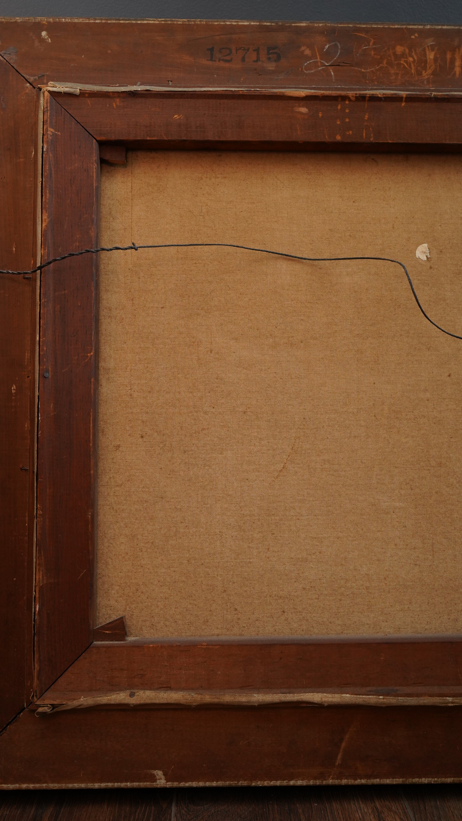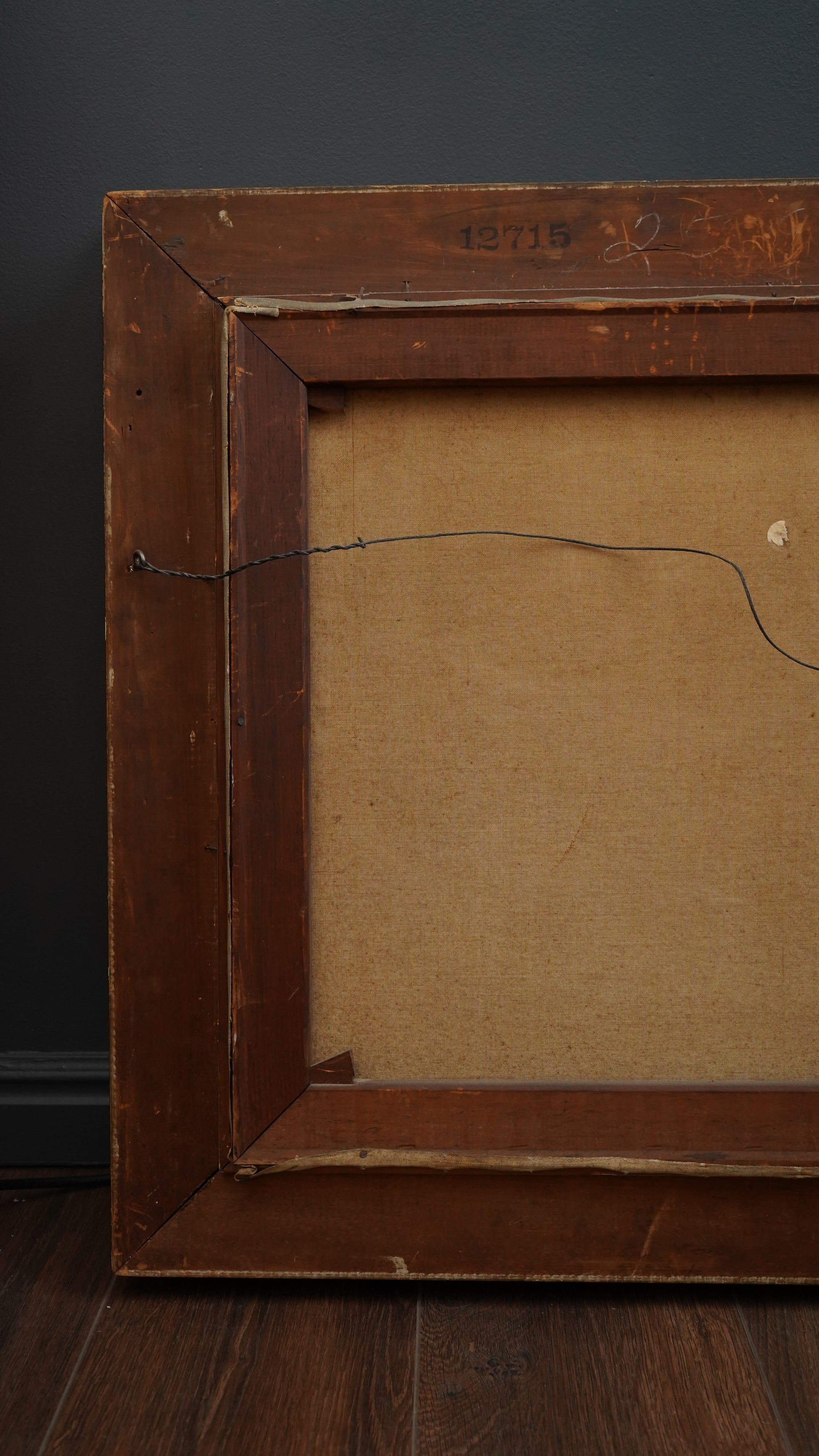 The painting sits in its original gilded gesso frame, which has the classic ornate profile used around the turn of the century. The number stenciled on the back suggests it once passed through an auction house or framing studio. Even with imperfections, the piece has strong decorative impact and an authentic antique character.