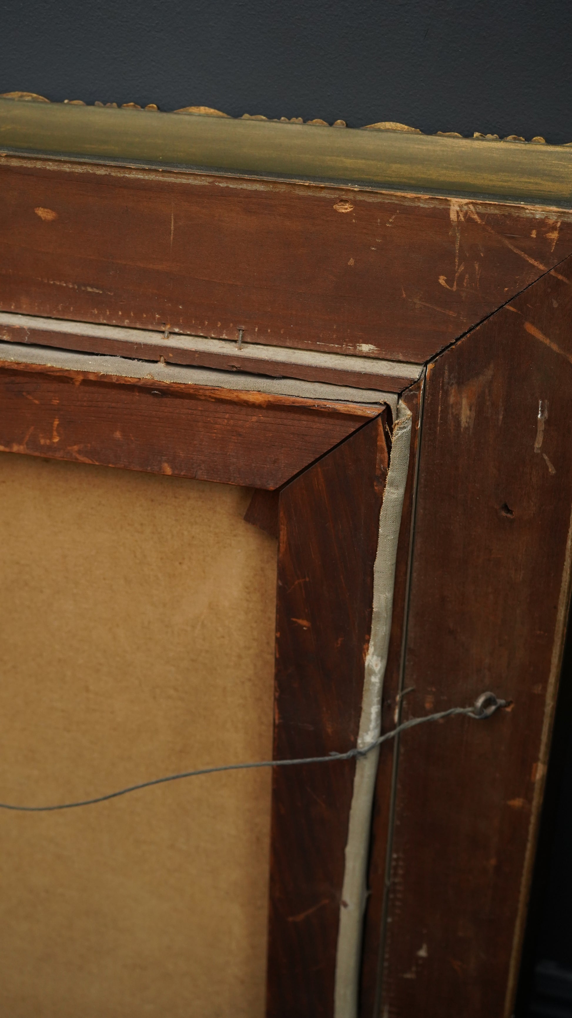 Painting is in fair antique condition. There is a small area of paint loss in the upper left section and scattered surface abrasions consistent with age. The upper right quadrant shows a change in sheen that suggests past restoration or selective varnish work. The reverse of the canvas shows an old abrasion but it is not active or structural. The gilded gesso frame has losses, including a missing section at the bottom right corner. The painting remains stable and display ready. Please review all photos.