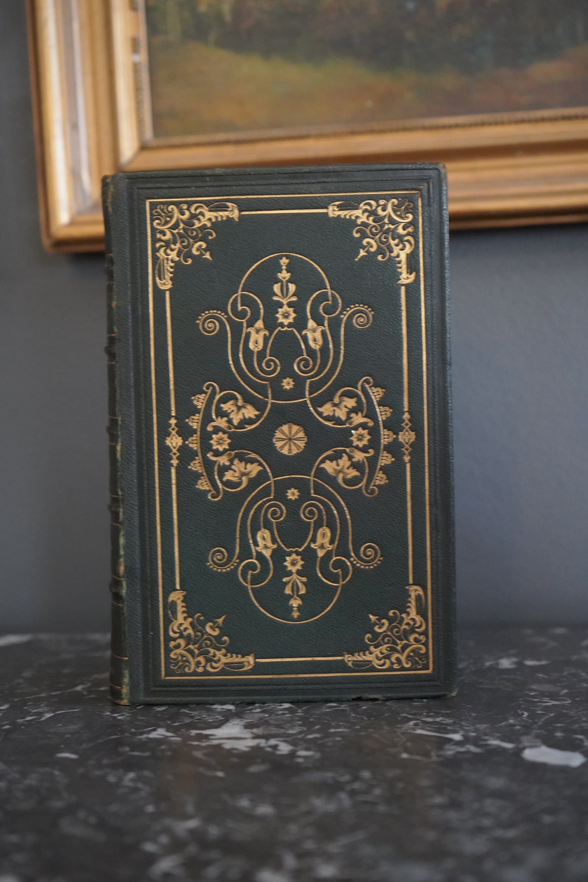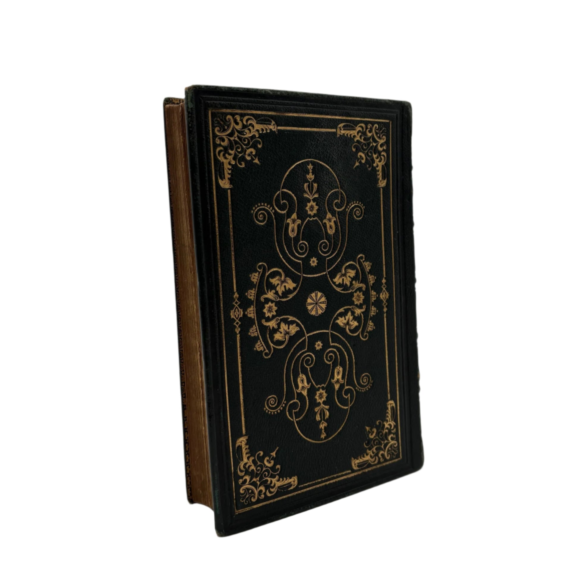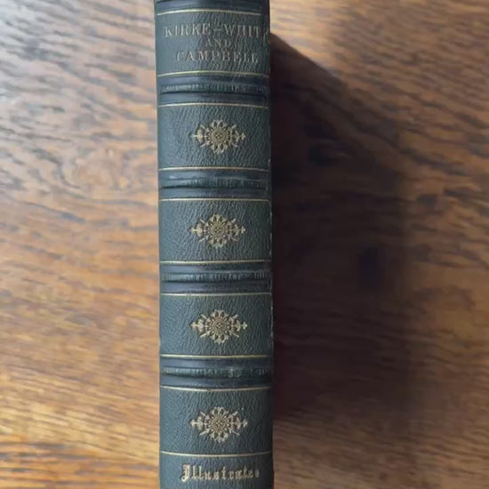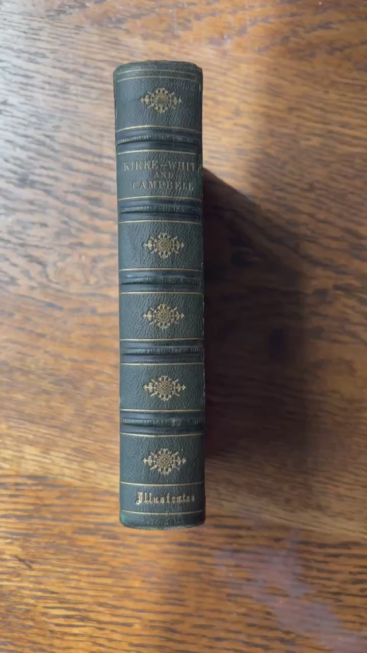 This 1855 edition features the poetical works and lives of John Kirke White and Thomas Campbell, two celebrated poets of the era. Bound in rich dark green leather with detailed gold embossing, it combines biography, poetry, and engraved illustrations. Kirke White’s reflective poems on youth and nature sit alongside Campbell’s stirring verses on hope and social progress. Designed as both a beautiful keepsake and a thoughtful read, this book captures Victorian tastes for elegant, meaningful literature.