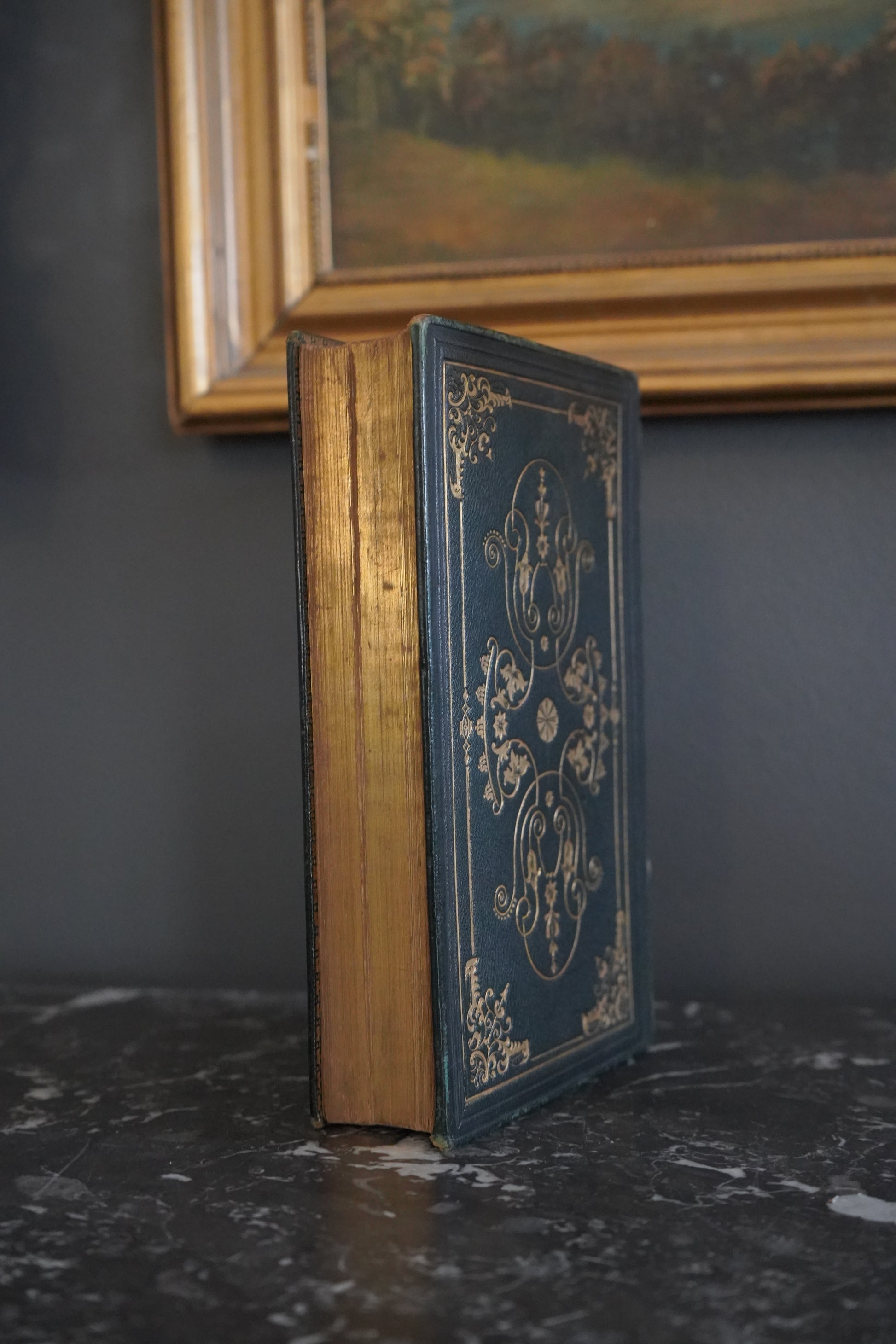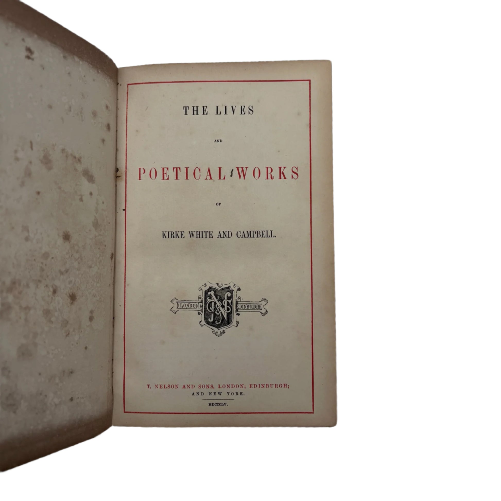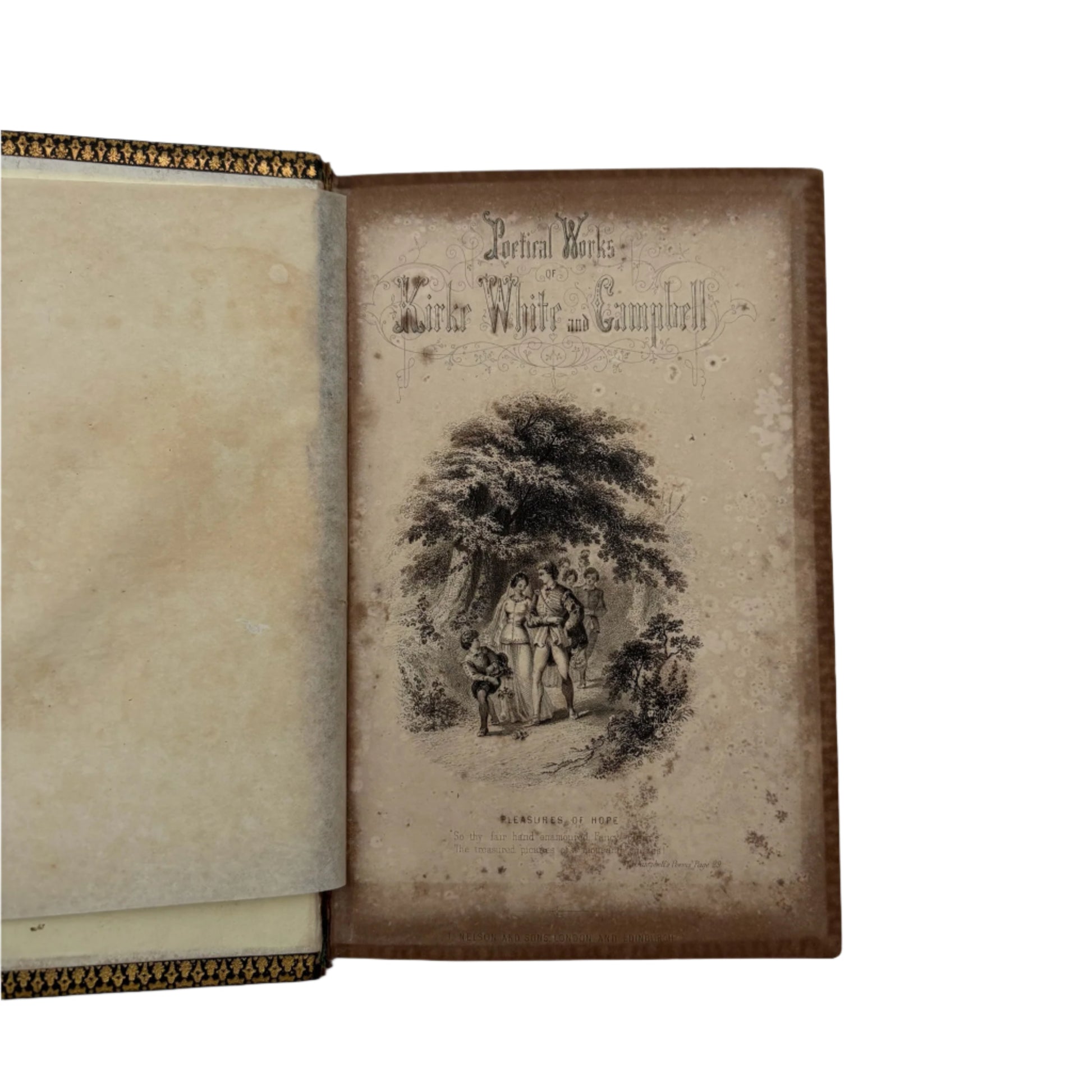 This 1855 edition features the poetical works and lives of John Kirke White and Thomas Campbell, two celebrated poets of the era. Bound in rich dark green leather with detailed gold embossing, it combines biography, poetry, and engraved illustrations. Kirke White’s reflective poems on youth and nature sit alongside Campbell’s stirring verses on hope and social progress. Designed as both a beautiful keepsake and a thoughtful read, this book captures Victorian tastes for elegant, meaningful literature.