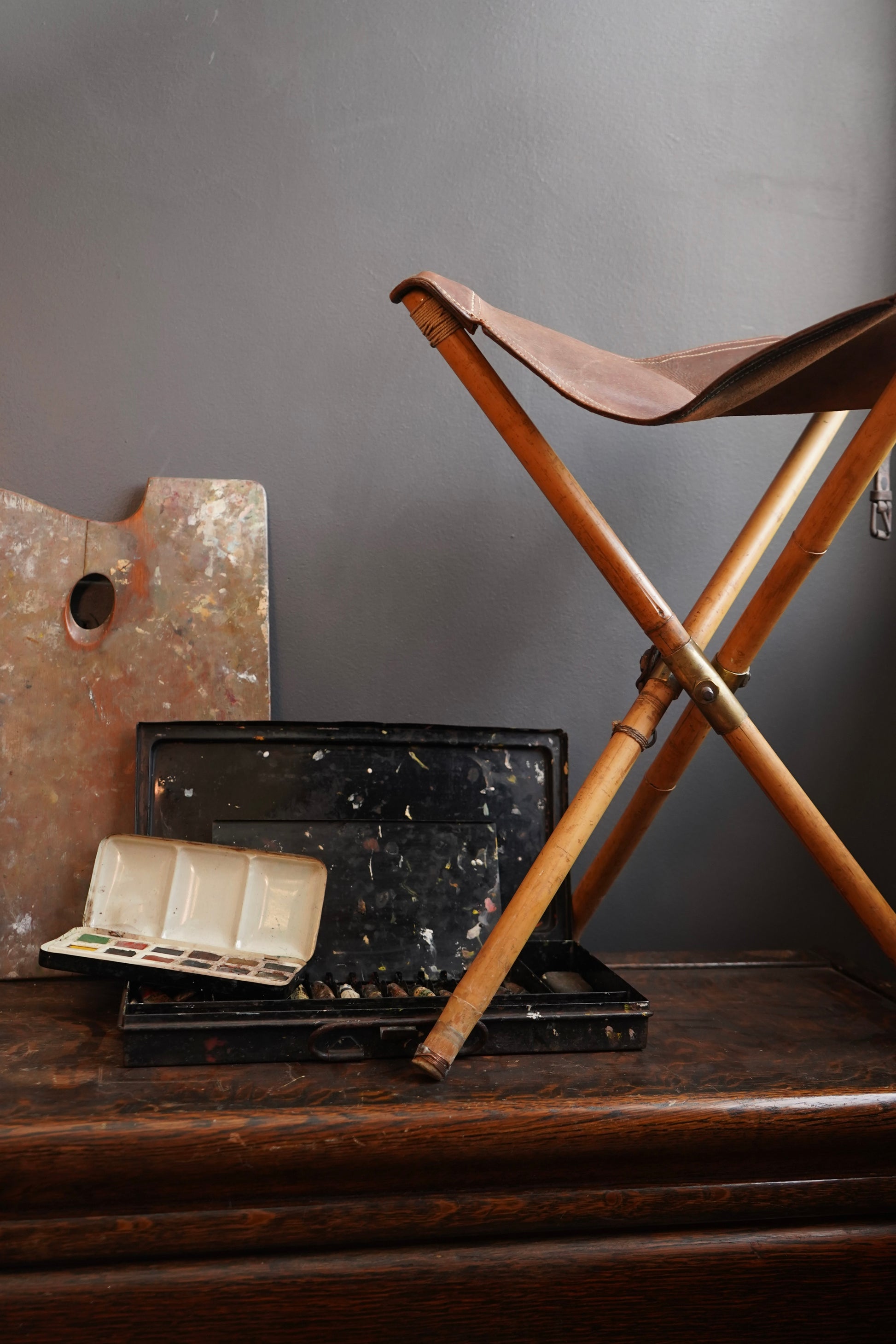 The folding stool, with its leather seat and bamboo frame, is a classic artist’s and traveler’s design, valued for its portability and comfort. The metal paint box, likely dating to the early 1900s, opens to reveal divided compartments for paint tubes, brushes, and tools, along with a removable mixing palette bearing layers of historic pigment. The wooden palette shows rich buildup from repeated use, while the small tabletop easel completes the working setup.