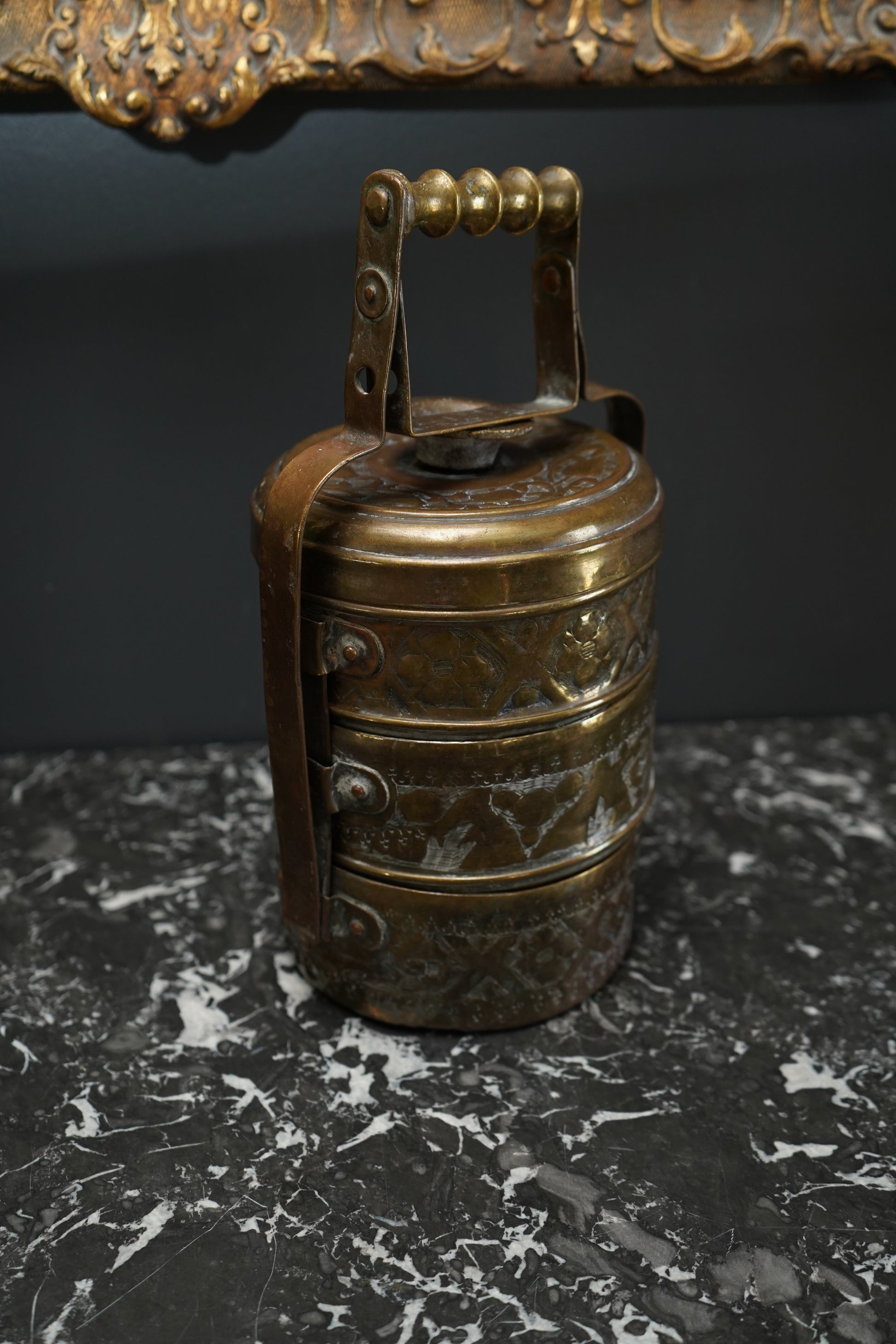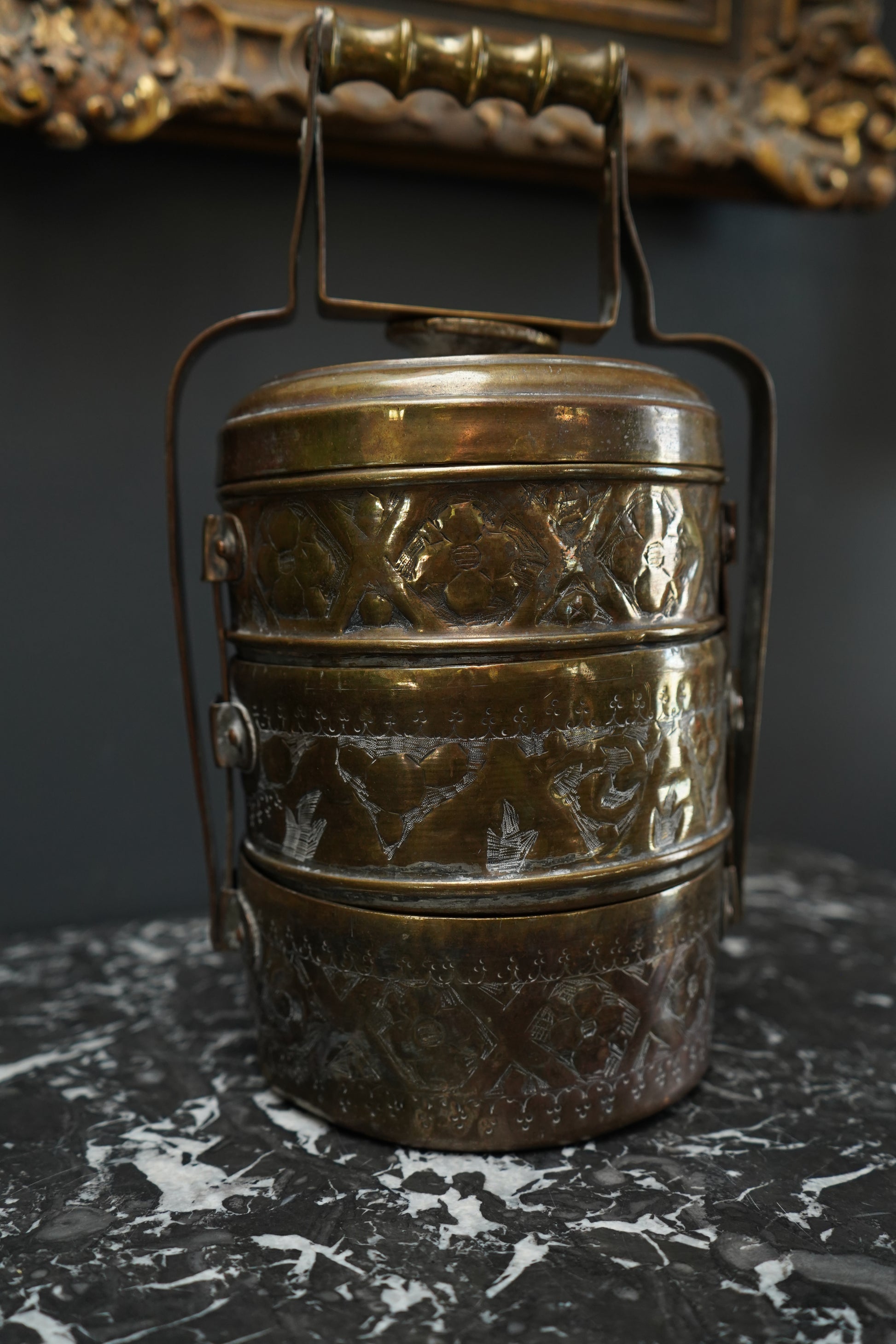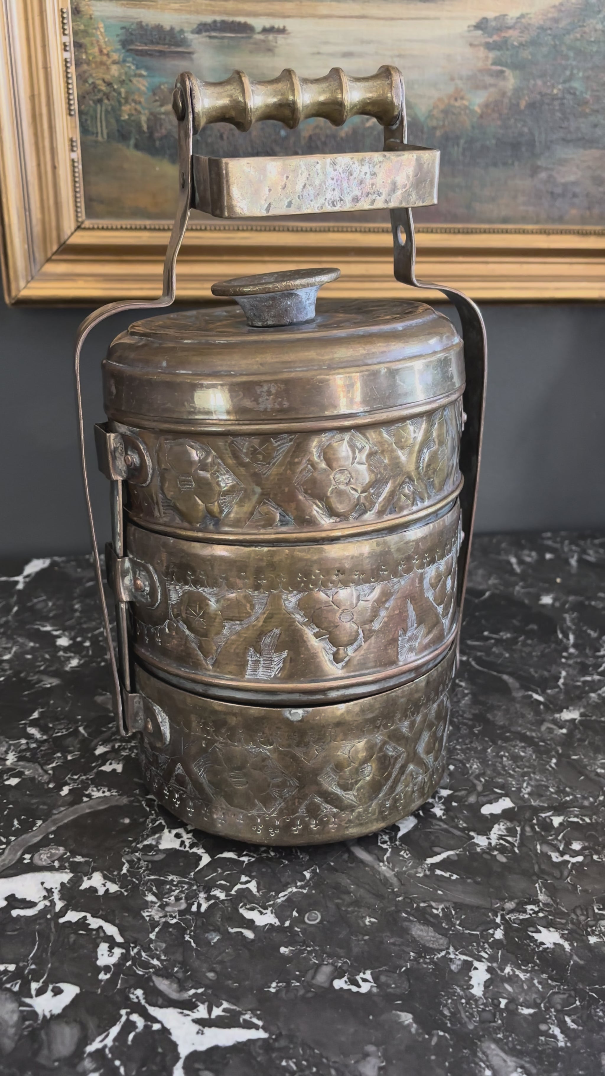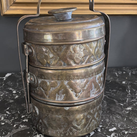 Vintage Brass Tiffin Carrier | Hand-Engraved 3-Tier Food Container with Handle