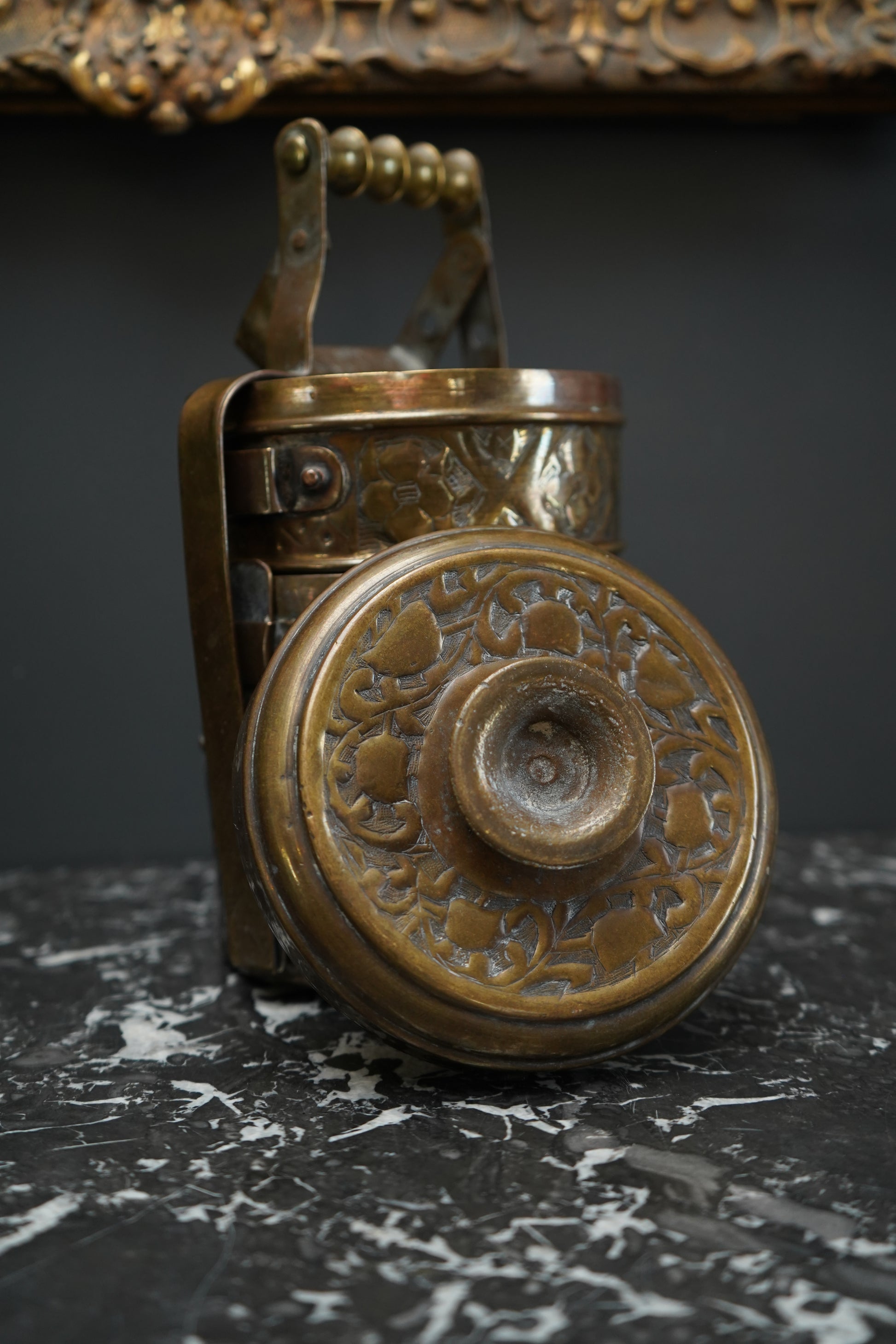 The carrier shows age-related wear consistent with its vintage nature, including surface patina, minor scratches, and light tarnish to the brass, which enhances its character. The compartments stack securely, and the engraved designs remain crisp and detailed. Overall, it is in very good condition for display or decorative use.