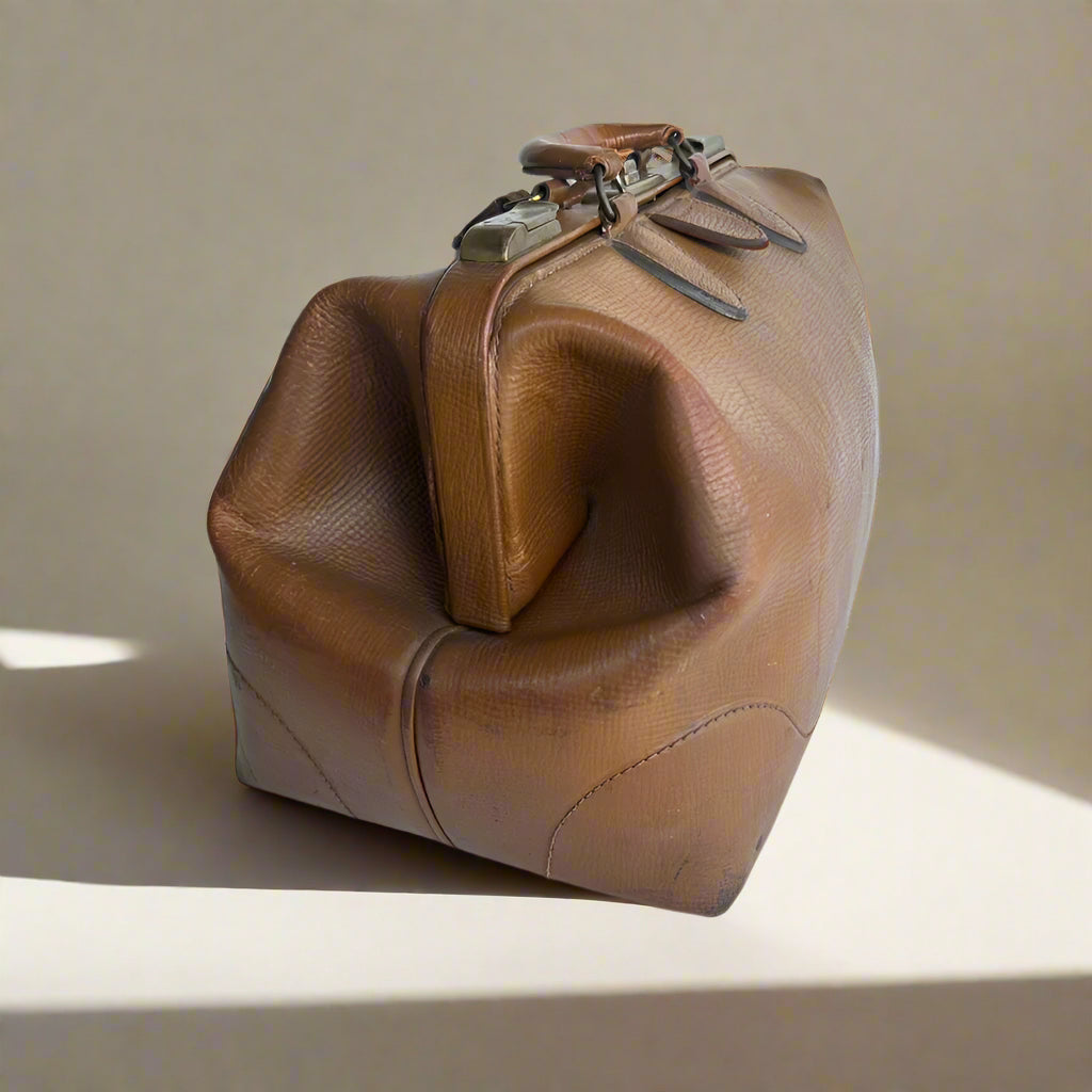Antique Cowhide Leather Doctor’s Bag with Monogram “H.B.S.” – Early 20th Century Travel Satchel