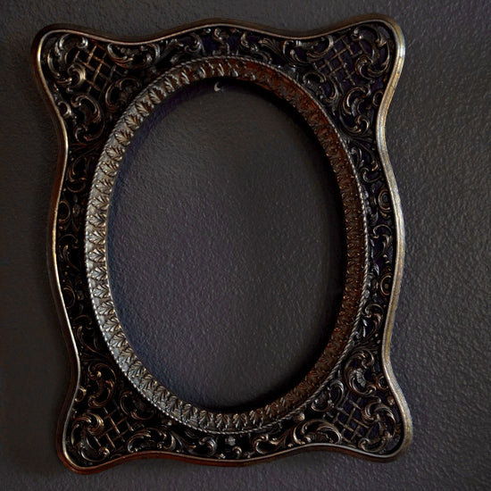 This vintage French picture frame, dating to the mid-20th century (c.1930–1950), is a beautifully ornate brass casting with pierced openwork scroll and lattice motifs. The oval opening (4.75" H x 3.5" W) makes it perfect for displaying cabinet-sized portraits, small photographs, or even decorative inserts such as pressed flowers. Measuring 6" high by 4.75" wide overall, the frame carries the stamped mark “Mod. Dep.” on the back, short for “Modèle Déposé,” meaning Registered Design, a hallmark commonly used in France during this period. With its warm patina, intricate detailing, and timeless style, this frame makes a charming addition to any décor or collection.