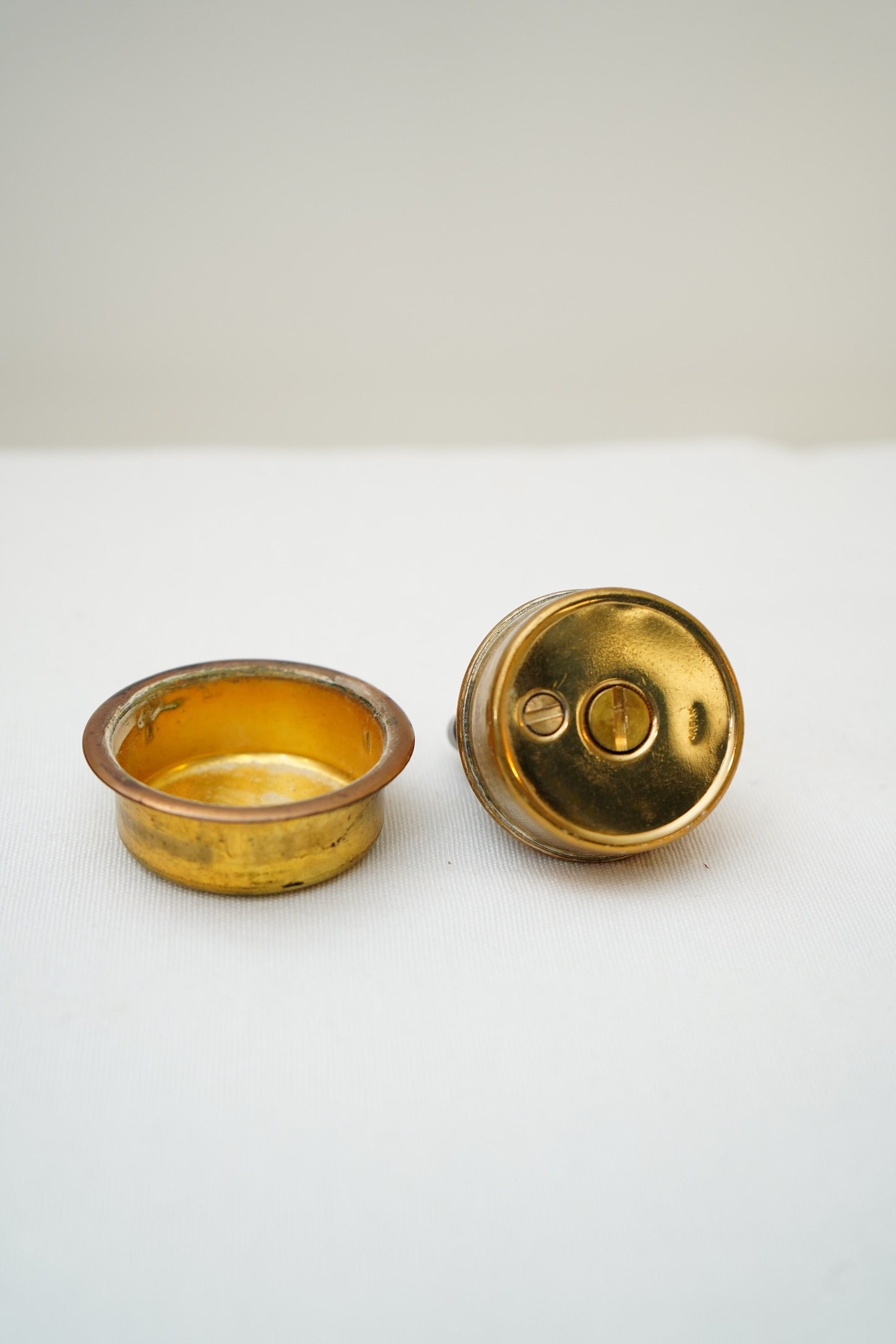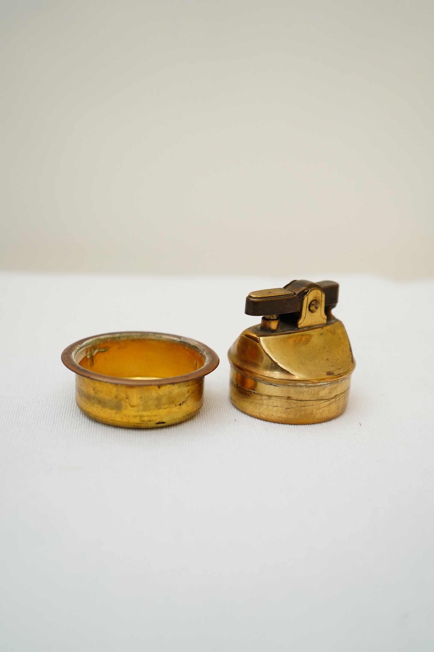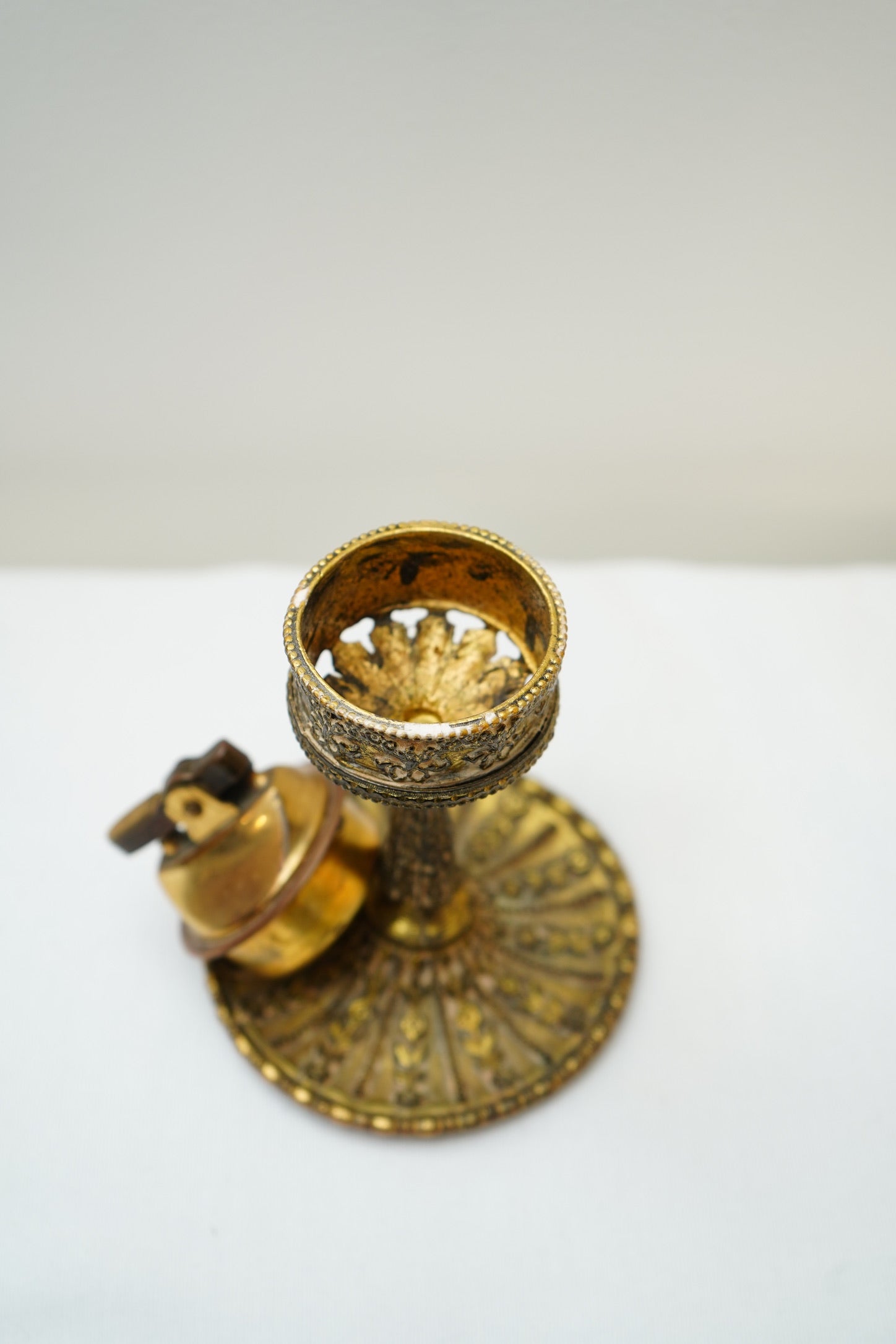 Light surface patina and rubbing to the gilt finish, with minor scuffs and handling marks consistent with use. Felt underside shows wear/spotting. Lighter shows typical vintage wear. * It will need a new wick and lighter fluid *
