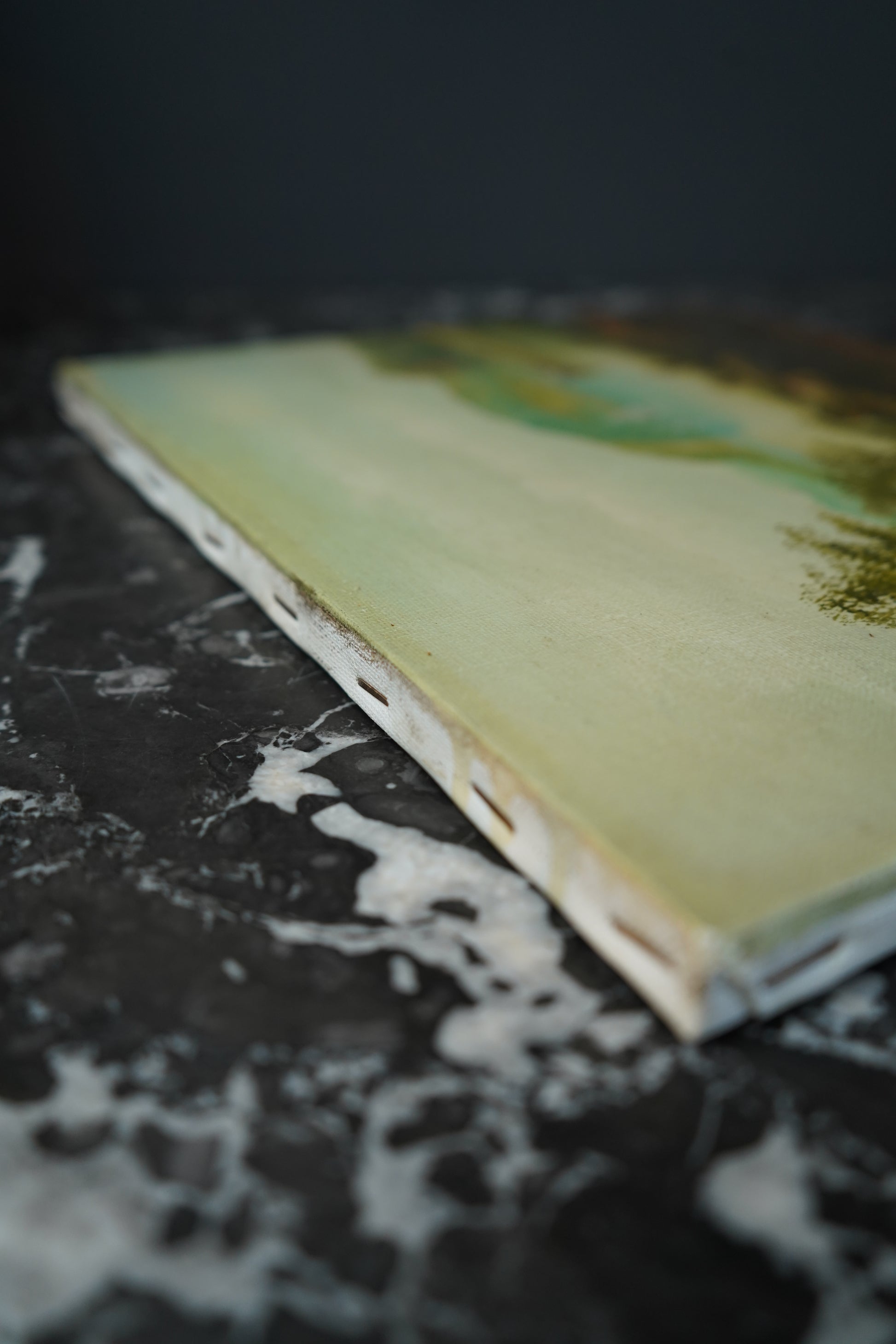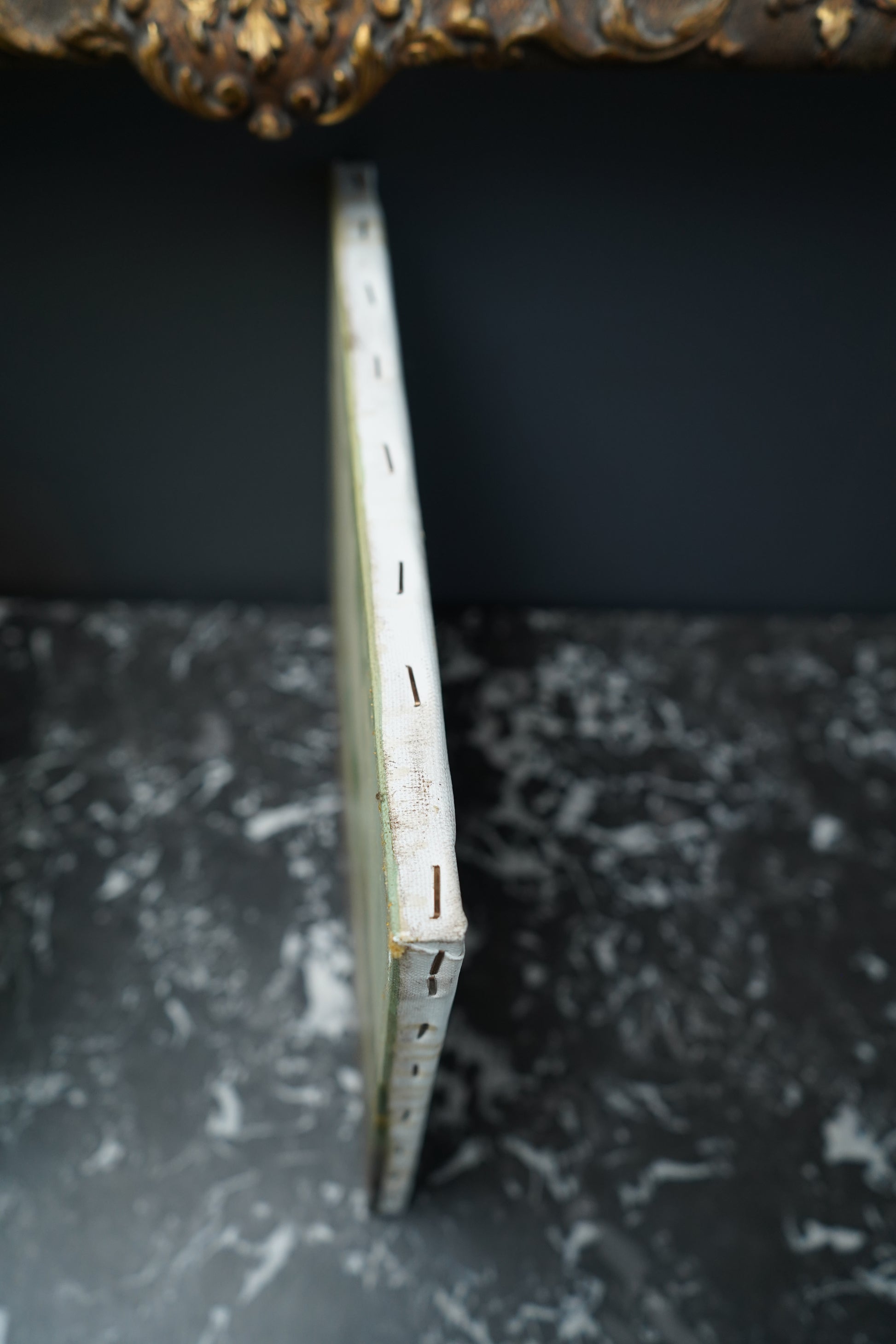 The painting is in overall good vintage condition. The canvas remains well-stretched and stable, with no signs of tearing or relining. There is light surface wear and scattered areas of age-related spotting along the edges, particularly at the lower border, which does not detract from display. The reverse shows a clean, bright canvas with a supplier’s stamp, indicating mid 20th-century production. The piece is currently unframed, ready to be displayed as is or paired with a frame of your choice.