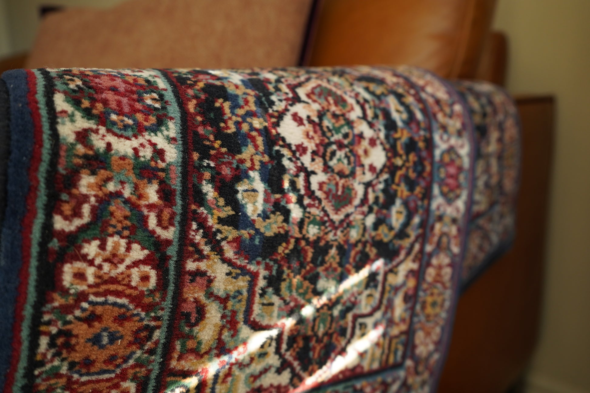 Vacuum lightly without a beater bar. Blot spills promptly with a wool safe solution. Use a thin pad or shelf liner if styling on a slick surface.