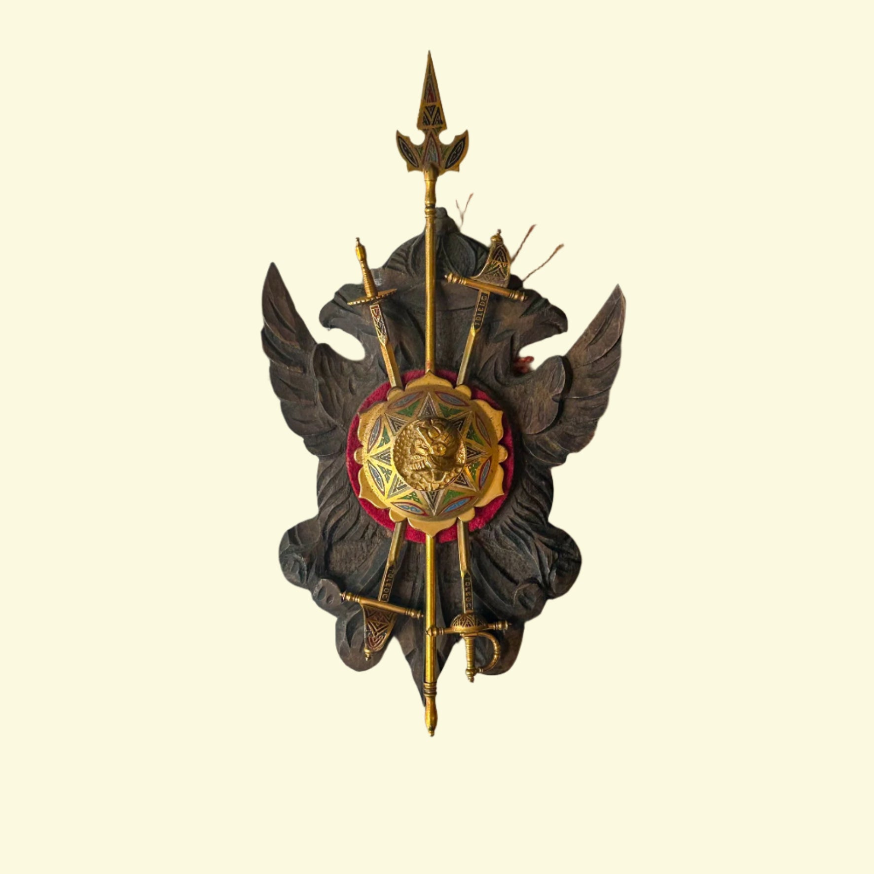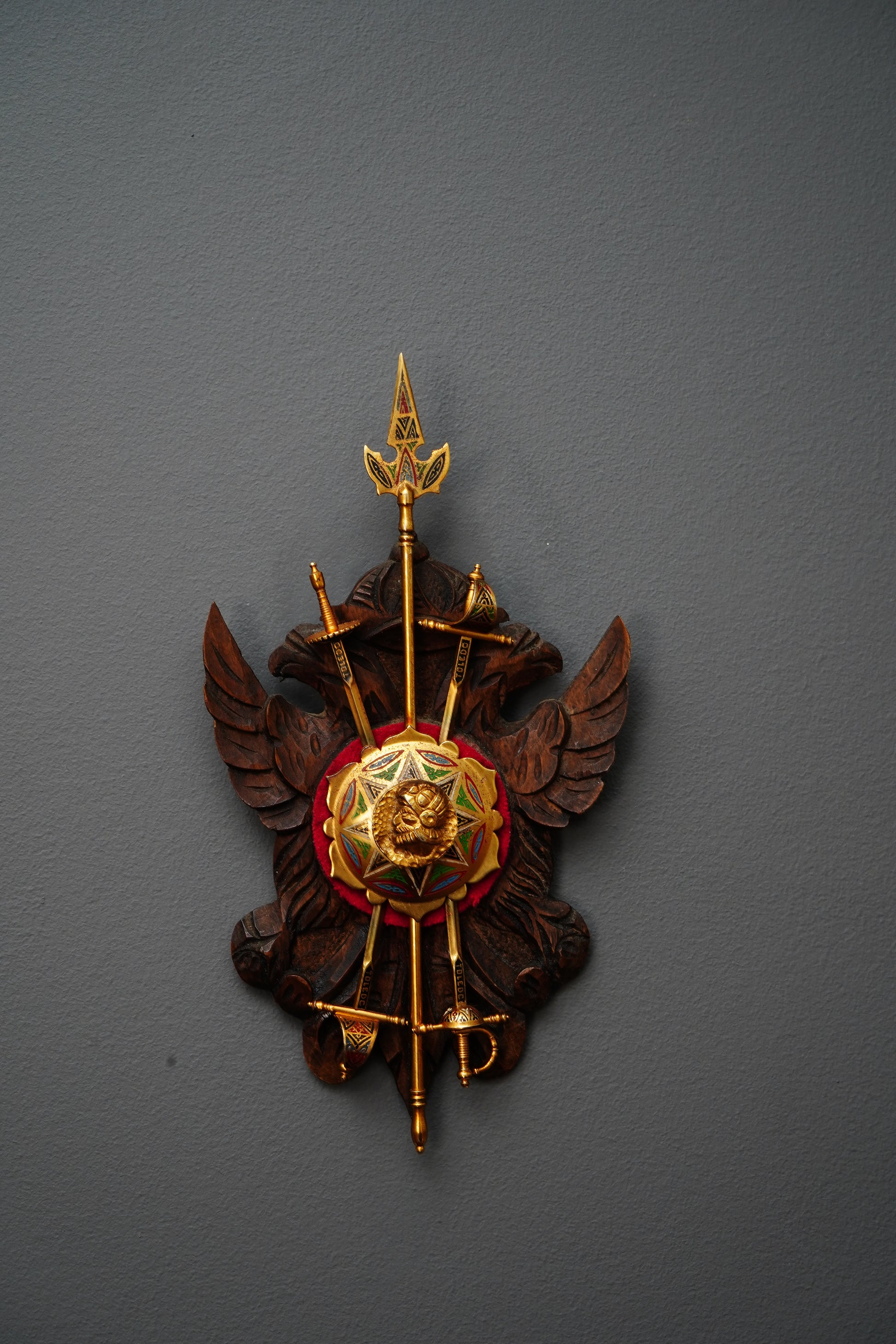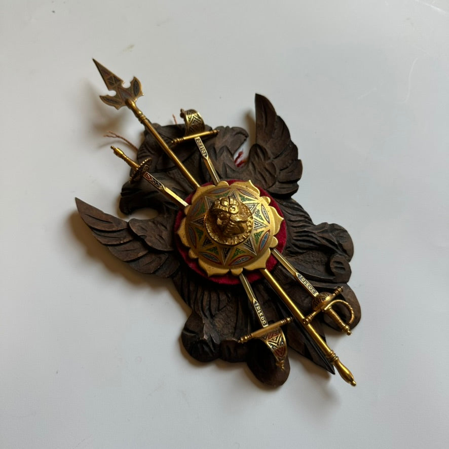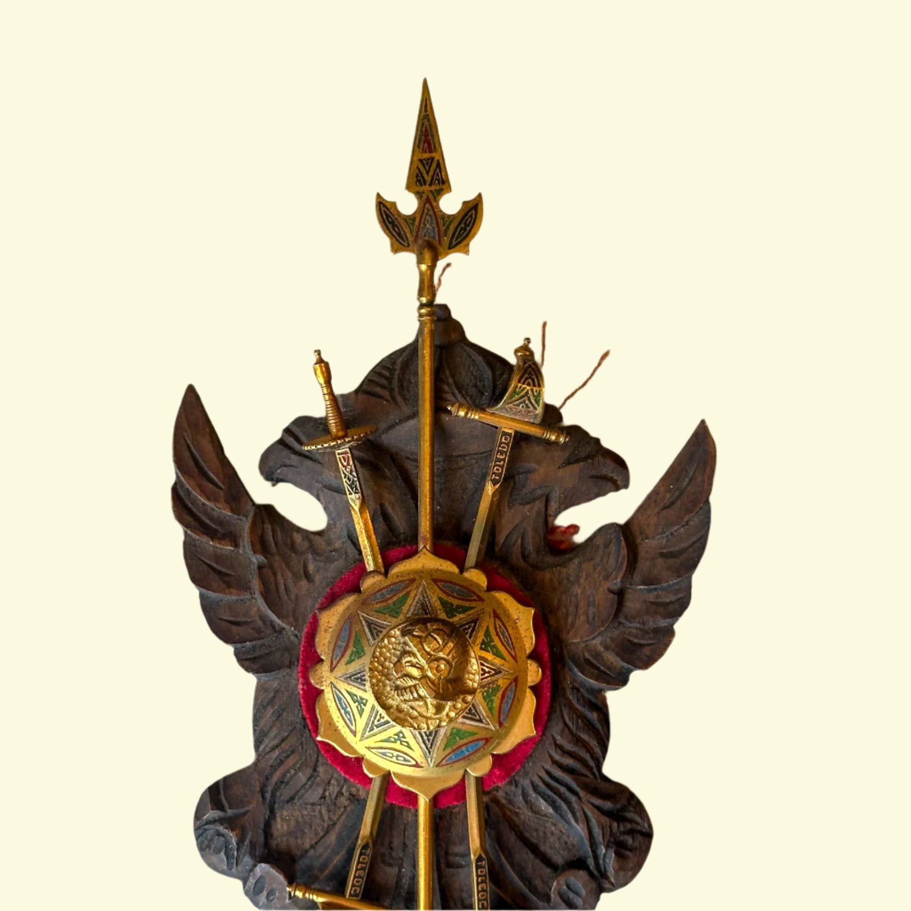 This small mid-century Spanish Toledo armory wall plaque showcases expert hand-carving and historic heraldic design. Featuring a wooden eagle-shaped backplate, gilt brass miniature weapons, and a vibrant enameled shield with a lion’s head, it honors Toledo’s famed sword-making tradition. Perfect for collectors and lovers of European history, it adds a refined touch of Old World craftsmanship to any space.
