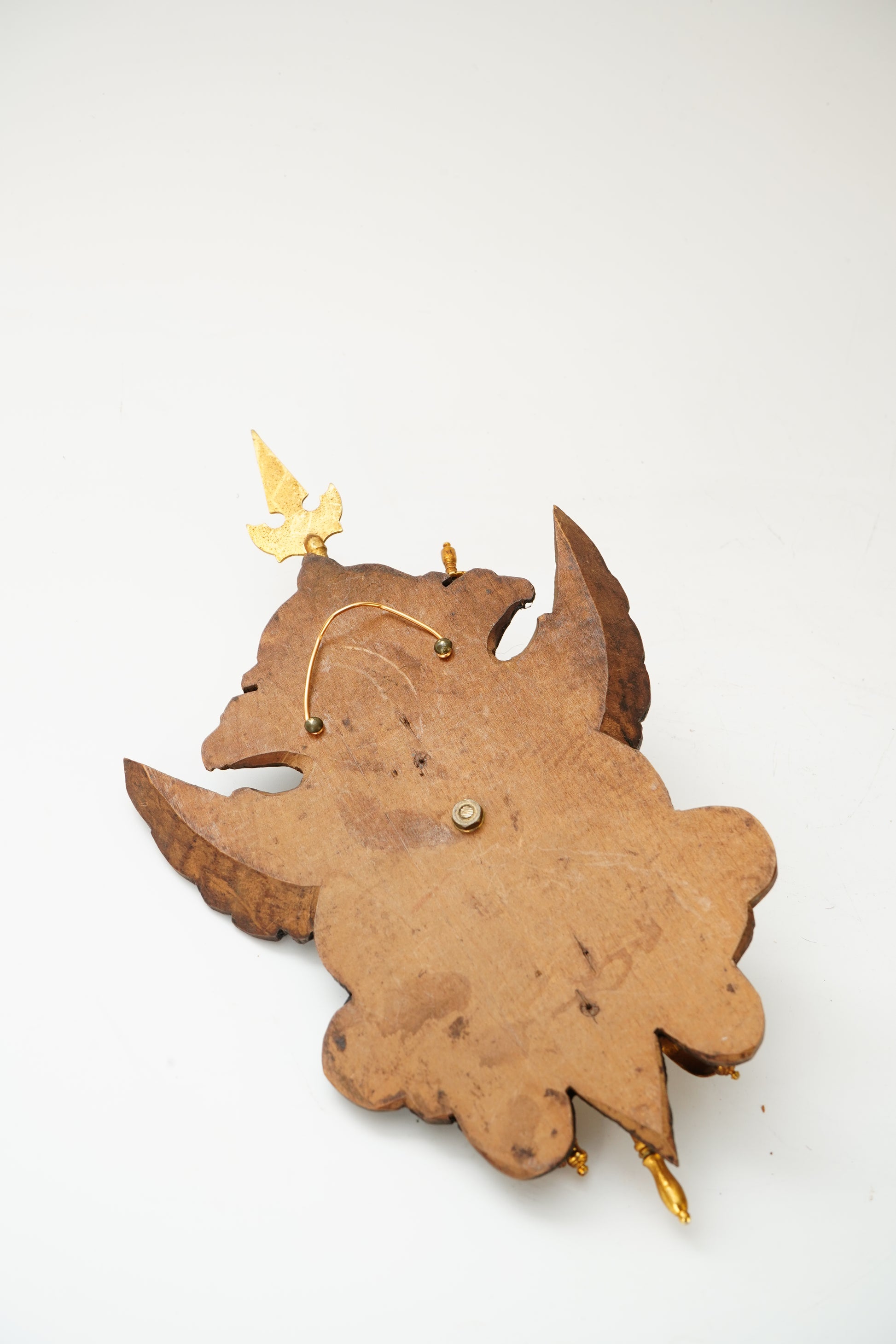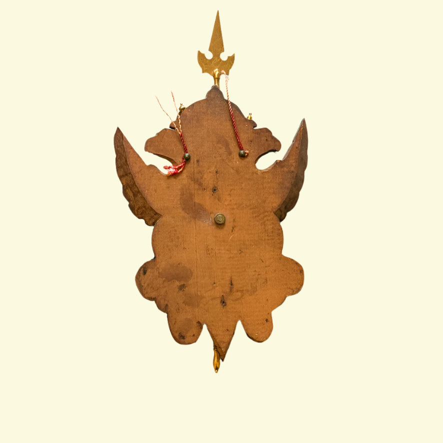 This vintage mid-century Spanish Toledo wall plaque is in good condition, showing light wear consistent with its age. The carved wooden backplate remains detailed with minor surface marks but no damage. The gilt miniature weapons have a warm patina and slight tarnish, while the red felt backing under the shield stays vibrant. Original hanging string and brass pins are intact but string will need to be replaced.